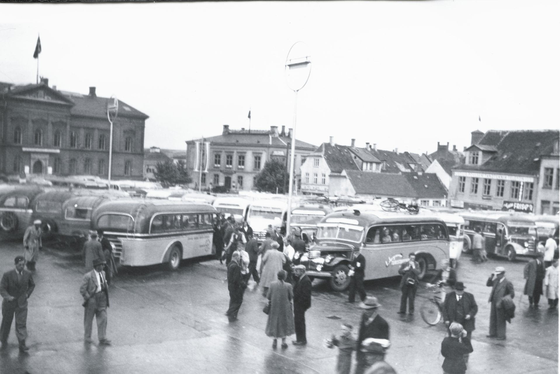 Scener fra Randers fra 1950'erne. Dragonregimentet, der her ses ved afskedsparaden, forlod Randers i 1951 og blev erstattet af ingeniørtropperne. Kasernen i Randers blev helt nedlagt i 1997. Oversvømmelser i Randers midtby i november 1955. Julebelysning i byens gader