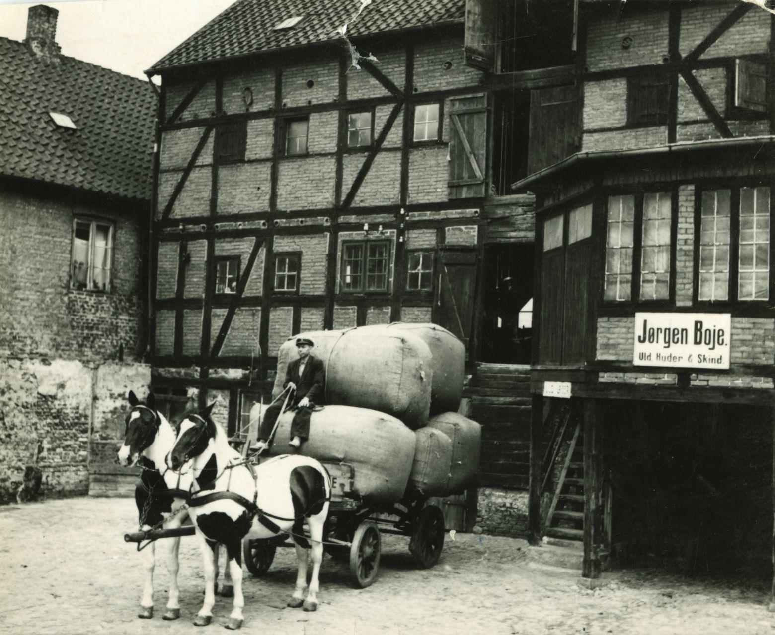 Filmen viser de mange arbejdsprocesser i firmaet: indvejning af uld og skind, vurdering og saltning af skindene, sortering af ulden, lagerarbejde og transport. Karakteristisk er de rigtig mange hænder, der beskæftiger sig med det manuelle arbejde. Selv presning af ulden i baller sker ved hånd-(fod) kraft. På filmen optræder også en del gange Jørgen Bojes heste. Hestespandet var produkthandlerens stolthed. Til hverdag trak knapstrupperhestene arbejdsvognen. Om søndagen blev de spændt for den fine vogn, som bragte familien rundt ikke bare i Randers, men også på mange ture ud i oplandet.