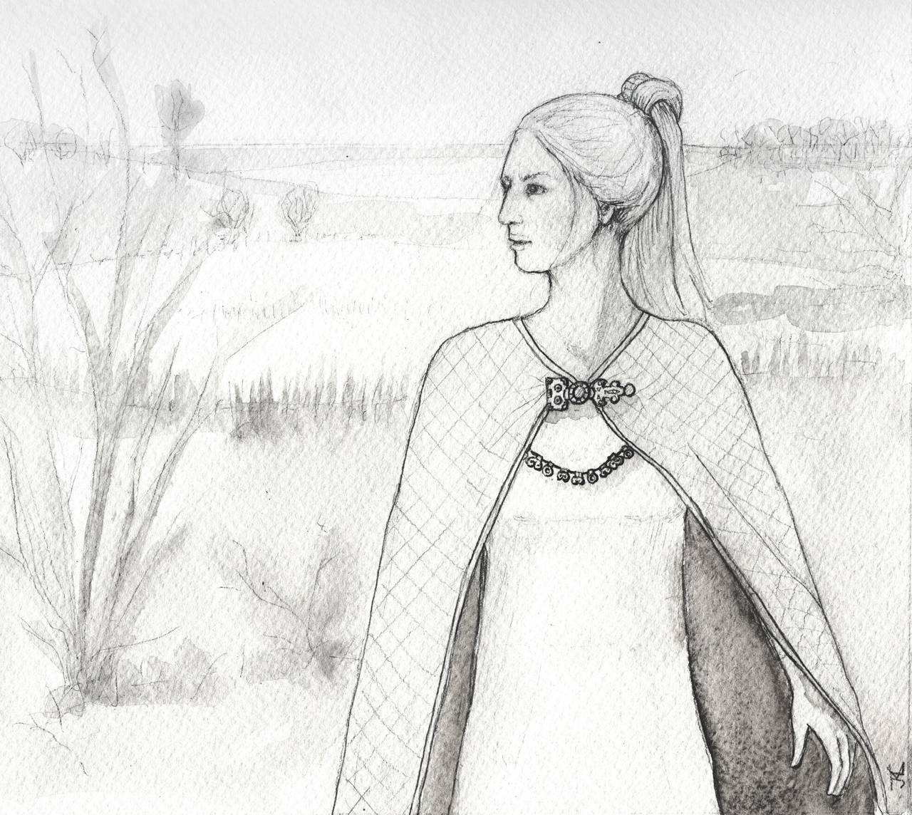 Rekonstruktionstegningen viser, hvordan smykkerne kan have været båret. Dragtspændet har formodentlig siddet på brystet af en kvinde, hvor den som en sikkerhedsnål har holdt kappen sammen. De ti hængesmykker har siddet i en snor, flettet læderrem eller kæde og prydet kvindens bryst.