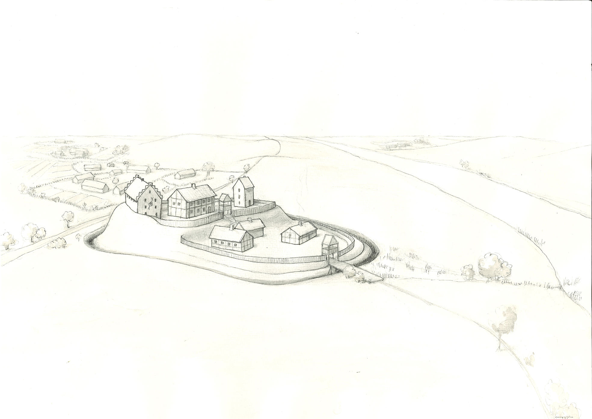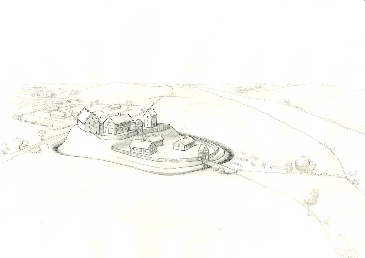 Udgravningerne kan dokumentere, at stedet blev anlagt helt tilbage i slutningen af 1000-tallet. Indledningsvist synes det ikke at have været befæstet. I løbet af 1200-tallet blev dog anlagt en mindre vold og grav. Denne første befæstning var anlagt på et massivt lag af brændt materiale, hvilket peger på, at befæstningen skete som følge af et angreb og afbrænding af stedet.
