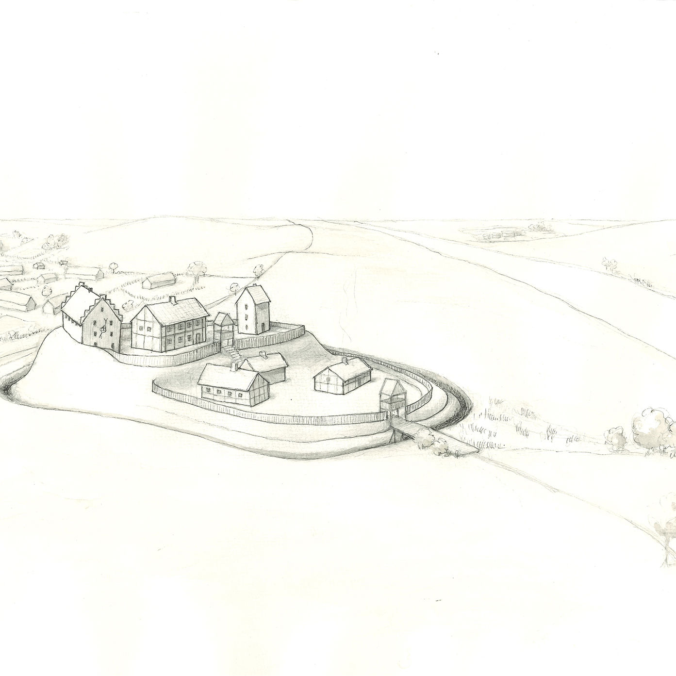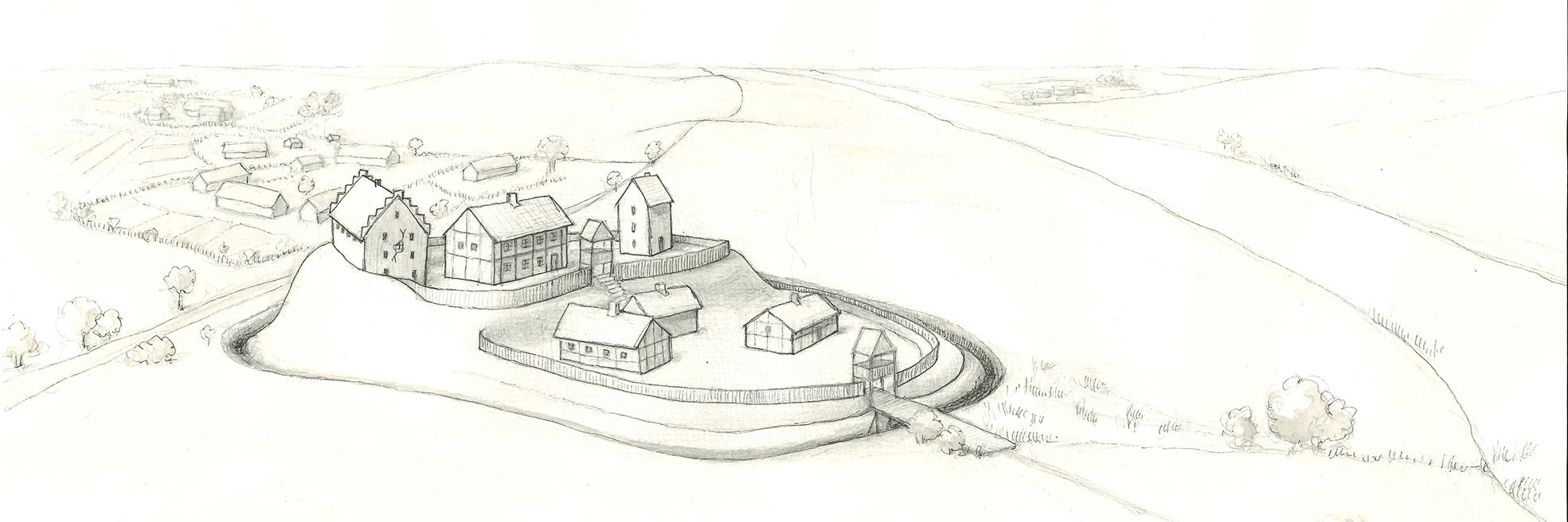 Udgravningerne kan dokumentere, at stedet blev anlagt helt tilbage i slutningen af 1000-tallet. Indledningsvist synes det ikke at have været befæstet. I løbet af 1200-tallet blev dog anlagt en mindre vold og grav. Denne første befæstning var anlagt på et massivt lag af brændt materiale, hvilket peger på, at befæstningen skete som følge af et angreb og afbrænding af stedet.