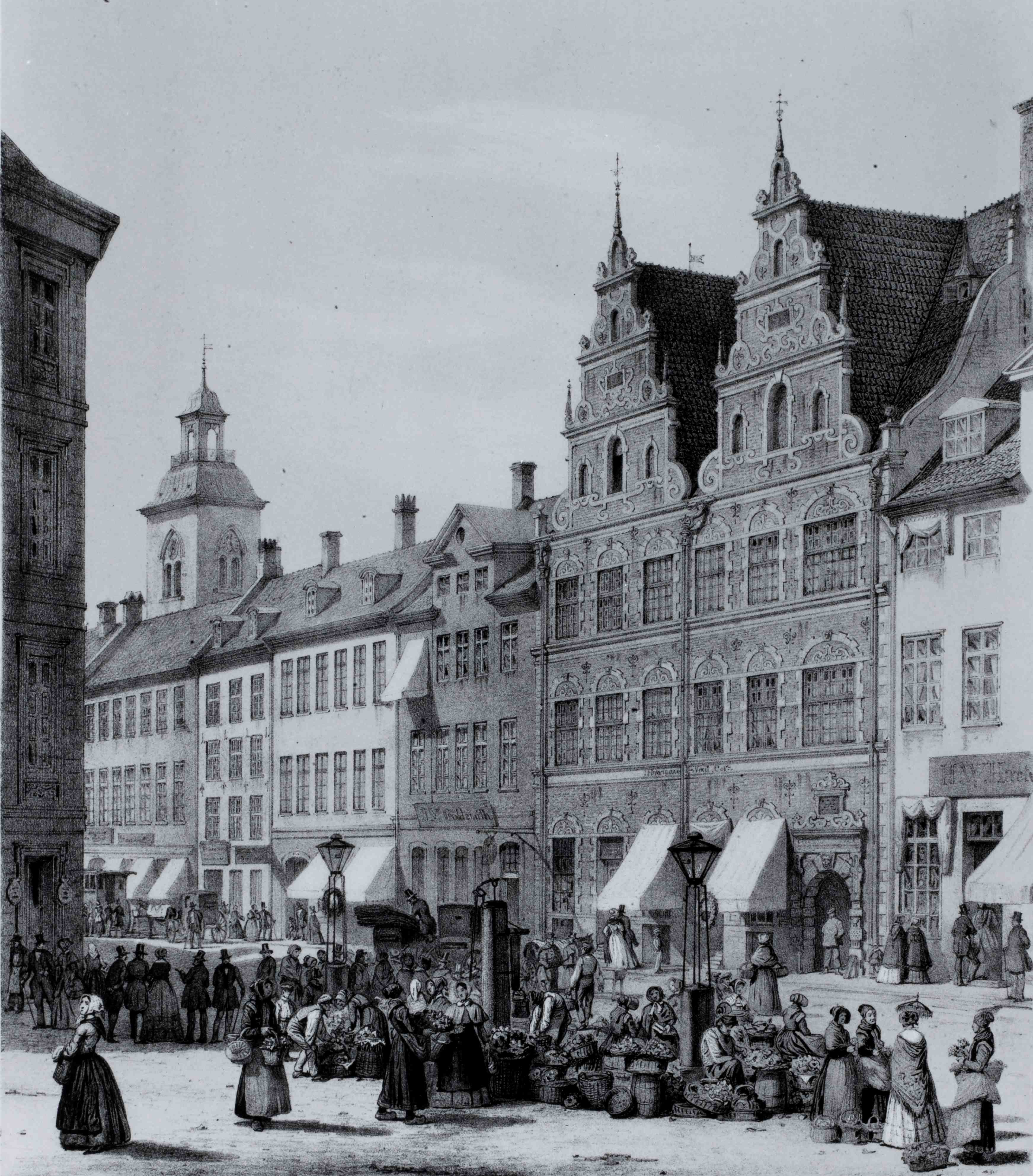 I perioden 1846-1847 lå Louise Rasmussens butik på 1. sal på Amagertorv 5. Tryk af Heinrich Hansen af Amagertorv set mod Helligåndskirken, 1840-1870. Kilde: Københavns Bymuseum.
