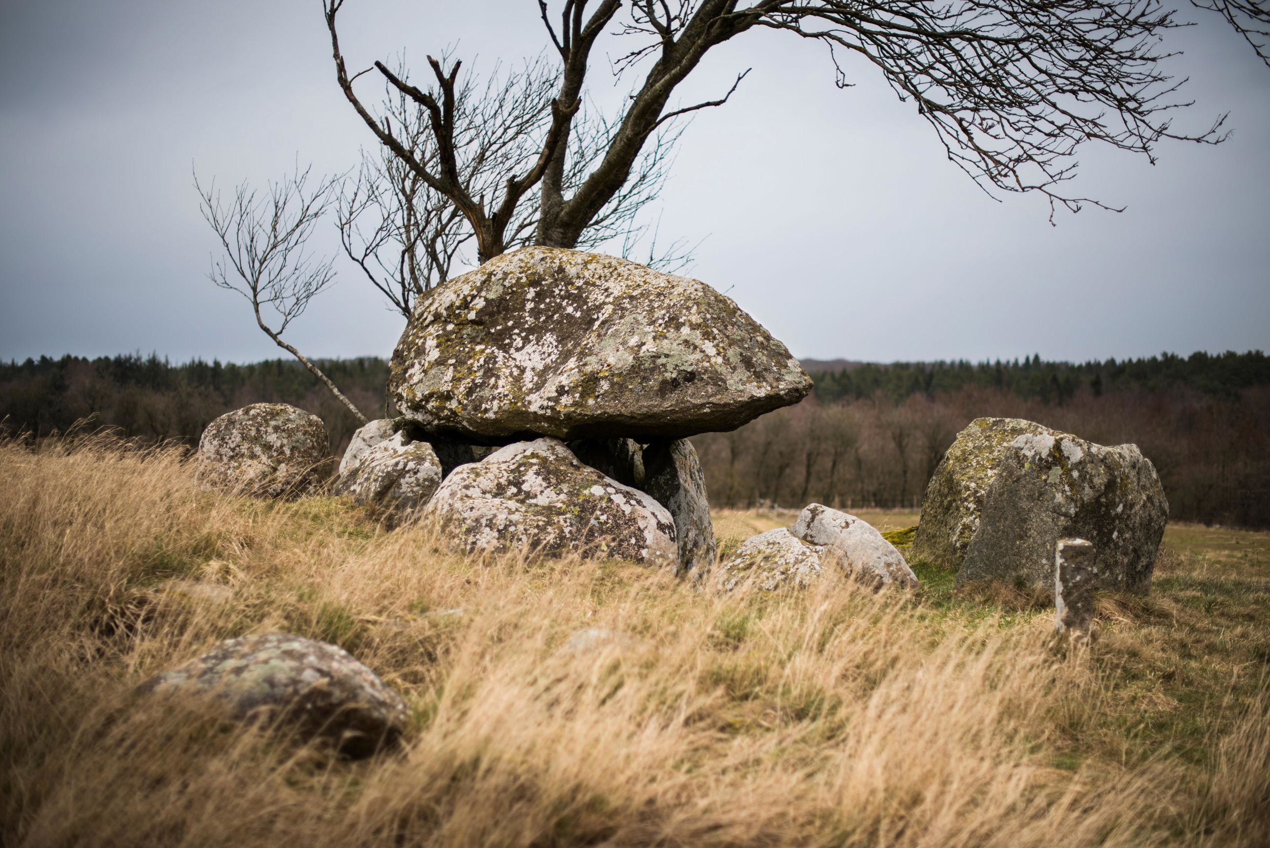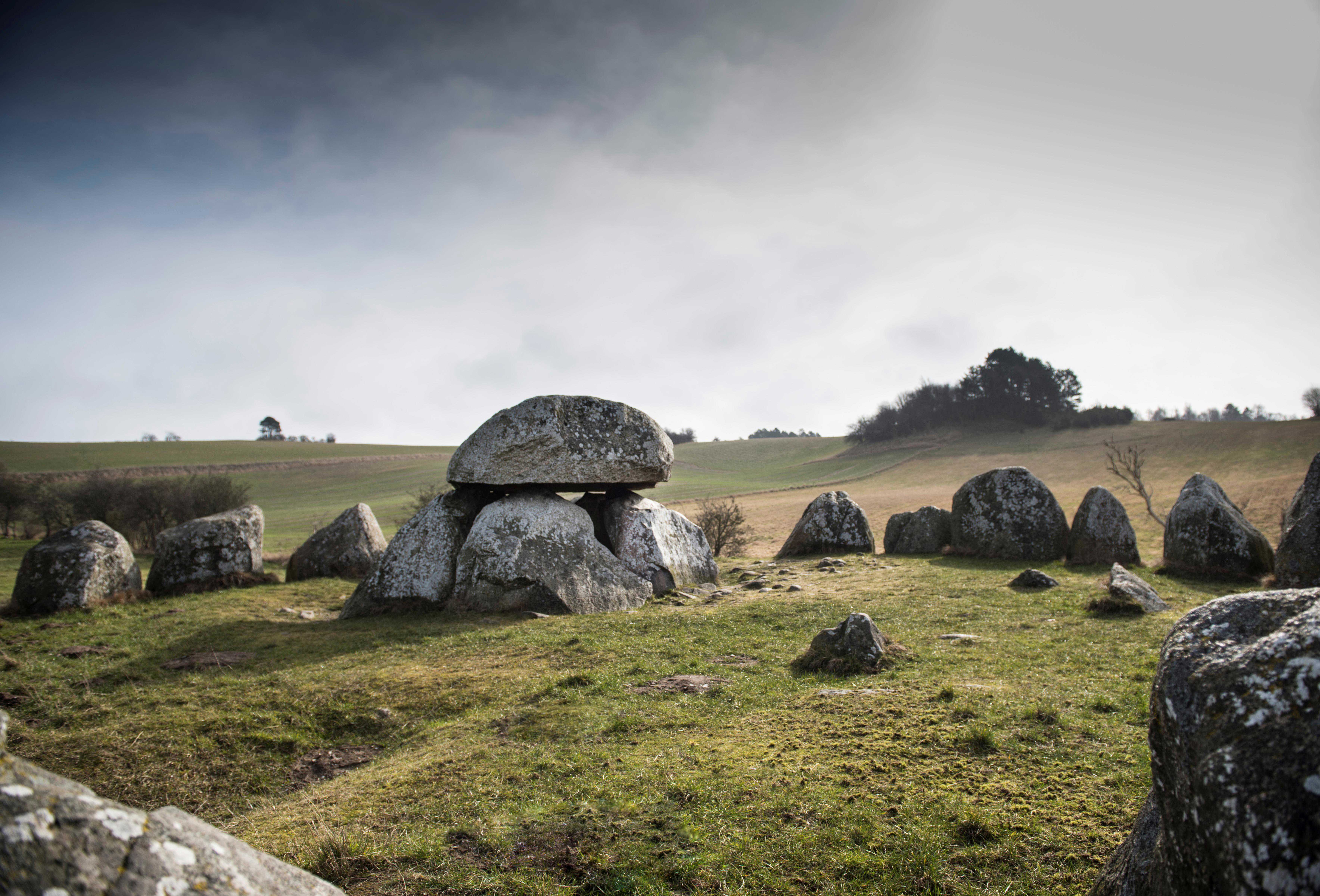 Throughout the Danish landscape there are still the remains of several thousand stone cists from the Neolithic Age. But there is nowhere else in Denmark where you can find a complex like the one, set in a wonderful natural setting by Tustrup. The preserved complex consists of two smaller dolmens and one passage grave, which is among the biggest in Jutland, and which can be accessed by the public. As a remarkable feature the stone cists are placed in a semicircle around a place of worship, where rituals have been performed at the funerals taking place in the passage grave and dolmens 5,200 years ago.